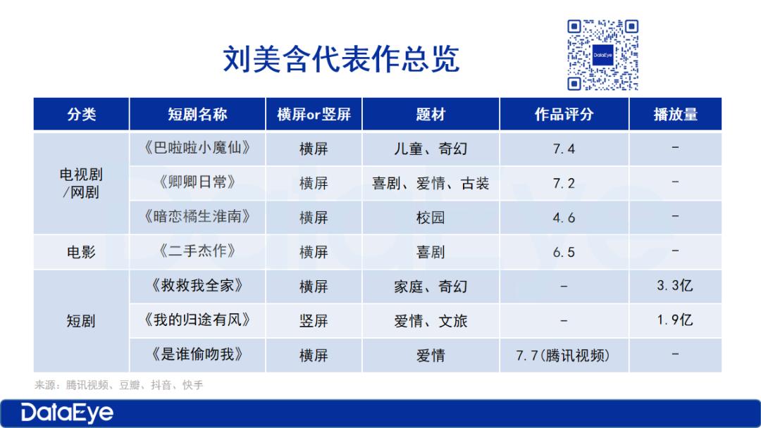 刘美含童星出身,入行将近20年。2023年开始转战演绎短剧,其主演的竖屏文旅短剧《稳定归途有风》在抖音平台播放量接近2亿,而另一部横屏奇幻题材短剧《救救我全家》为品牌定制剧,在快手平台播出,播放量超3亿。