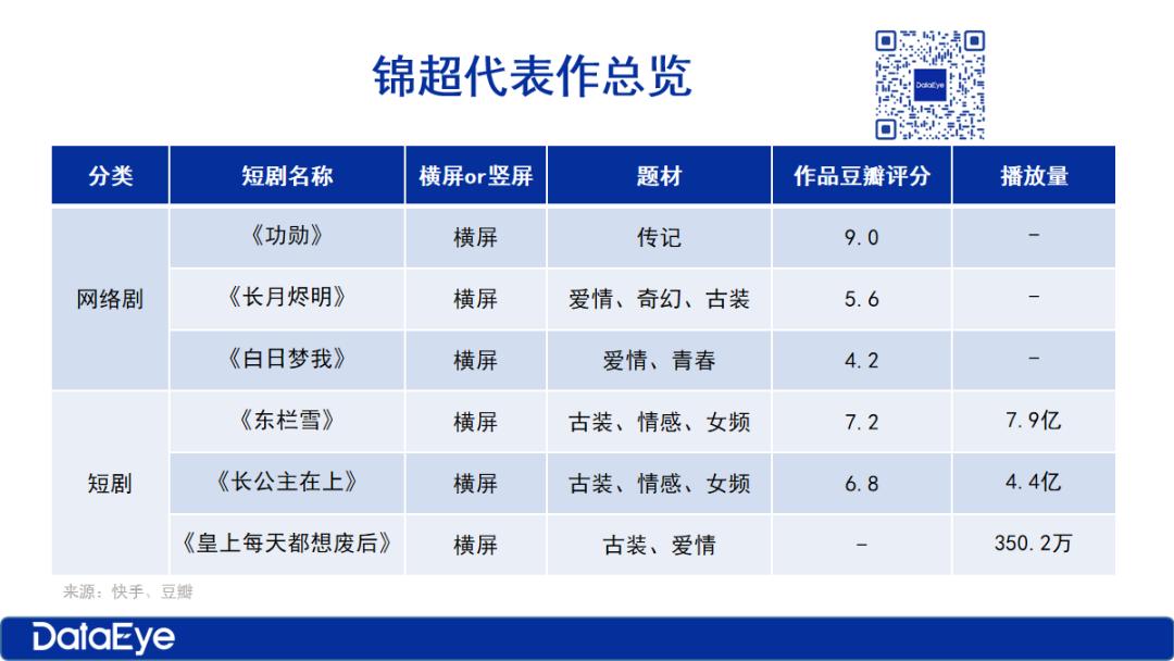 锦超相对于其他几位男演员入行时间较晚,短剧作品数量仅12部,但其作品市场口碑不错,目前是短剧、电视剧和综艺多方向发展。作品多以横屏的古装情感剧为主。