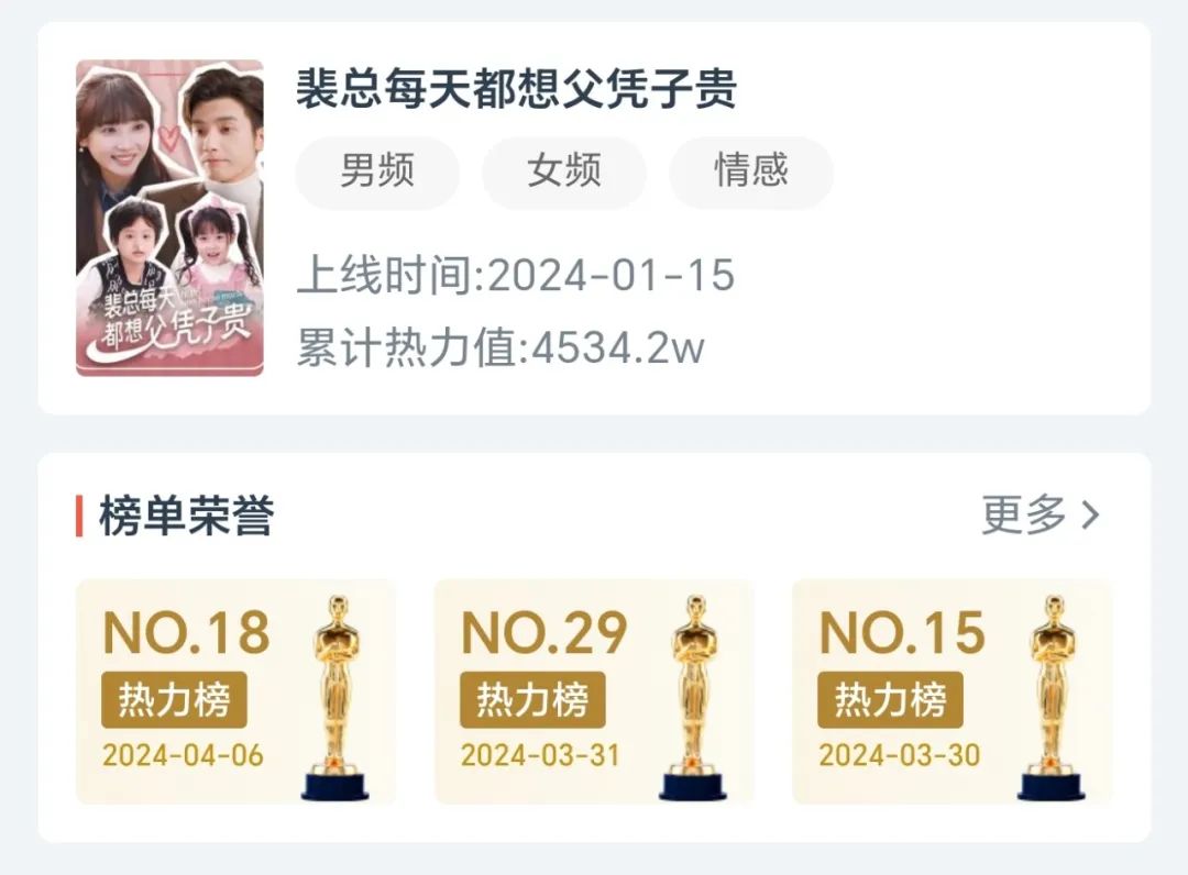 在他出演的短剧中,表现最出色的是今年1月上线的竖屏小程序短剧《裴总每天都想父凭子贵》,18次登上DataEye短剧热力榜TOP30,累计热力值超过4500W。