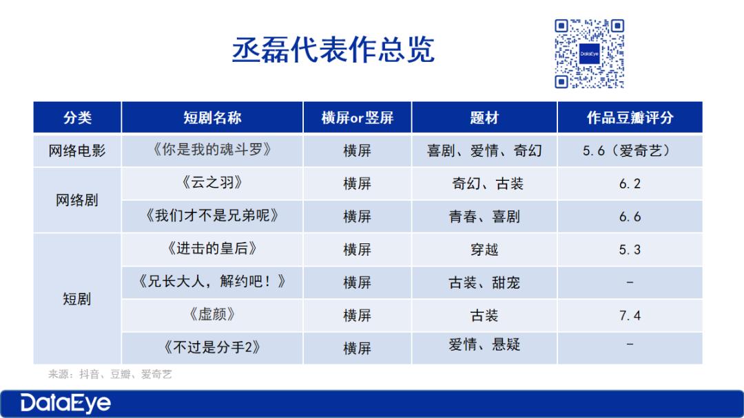 从作品的形式来看,丞磊主演的短剧作品以横屏的古装微短剧为主,每部18-24集,时长在10-15分钟左右,主要在芒果TV或腾讯视频等视频平台播出。