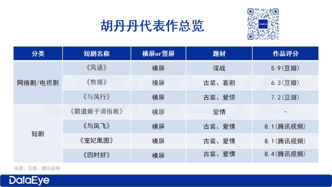 胡丹丹出演的作品多为古装爱情片,2011年入行,在演短剧之前,出演过20多部长剧作品。其主演的短剧以每集10分钟左右的横屏迷你剧为主,播出的平台主要为腾讯视频、芒果TV和爱奇艺等。