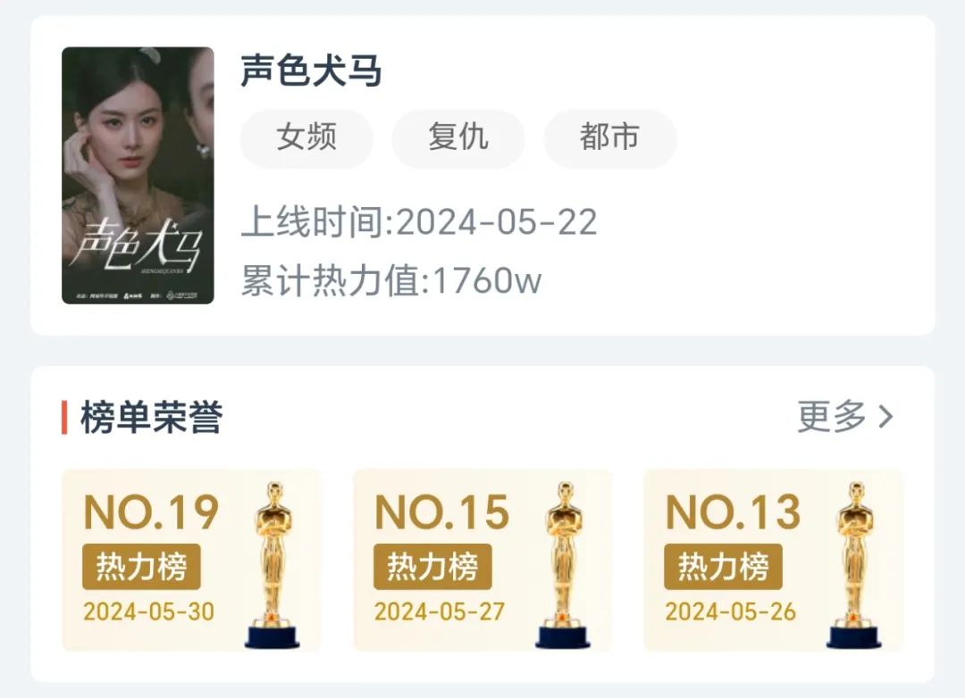其另一部女频悬疑题材作品《声色犬马》,播放量超1300W,7次登上DataEye短剧热力榜TOP30,累计热力值超1700W。
