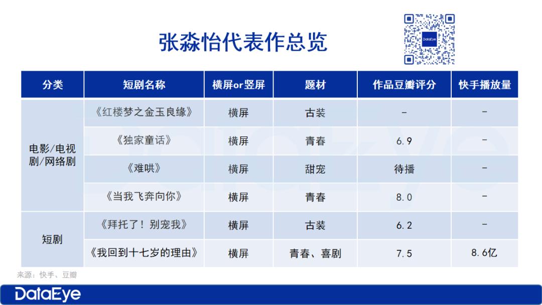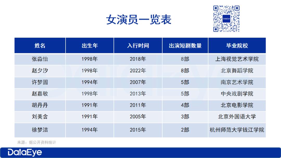 从作品数量来看,出演短剧作品较多的女演员有张淼怡、赵夕汐和许梦圆均在8部左右,相较于男演员的作品较少,但大多为专业院校毕业。入行较早的是91年的刘美含,是童星出道。此外,徐梦洁和赵嘉敏此前都并非影视演员出道,而是以爱豆身份出道,后转型成为演员。值得关注的是,女演员在短剧方面,大多数以横屏短剧和品牌定制剧为主。