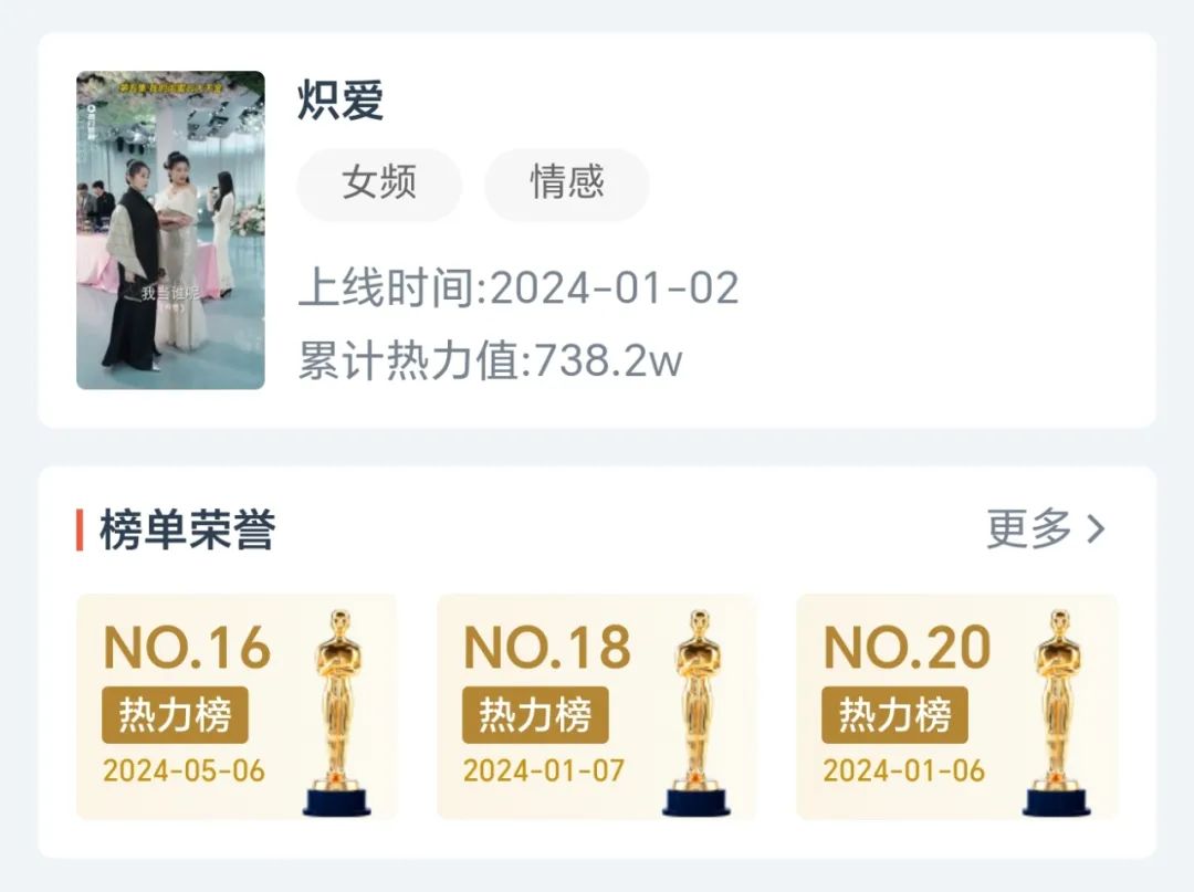 他主演的《炽爱》在抖音播放量过亿,今年1月上线,累计热力值超过730W,共5次登上DataEye短剧热力榜TOP20。