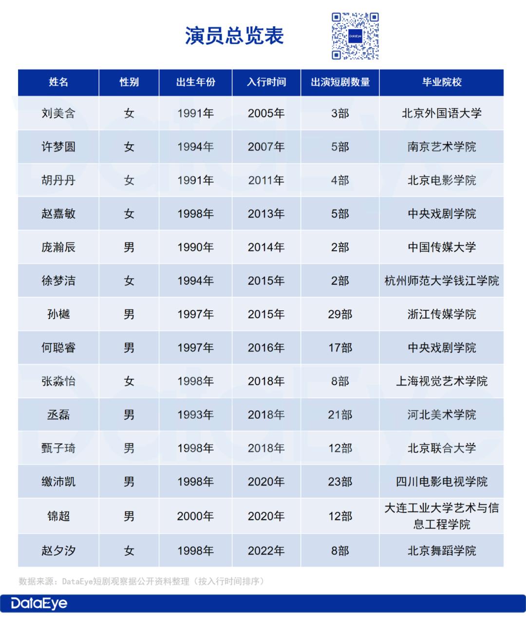 DataEye短剧观察,选取14位今年持续活跃在短剧中的,且曾经出演过多部电视剧、电影或话剧的演员进行盘点,男女各7位,发现以下趋势。