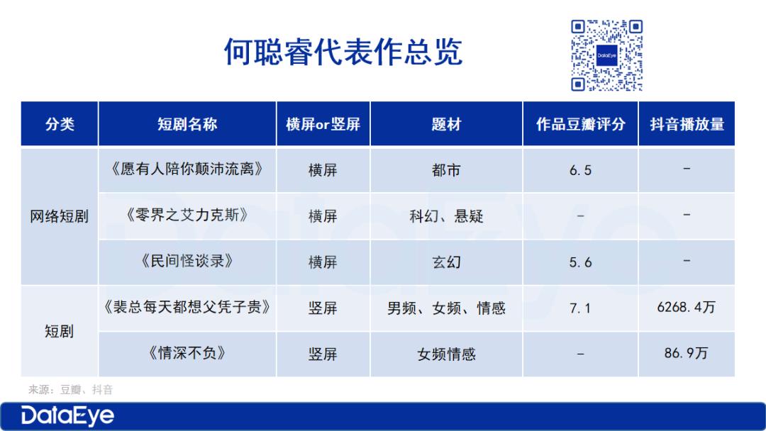 据DataEye短剧观察的不完全统计,何聪睿已经出演短剧17部,目前也以出演短剧为主。其短剧作品以竖屏的小程序短剧居多,题材多为女频情感剧,角色风格也大多为“霸道总裁”人设。