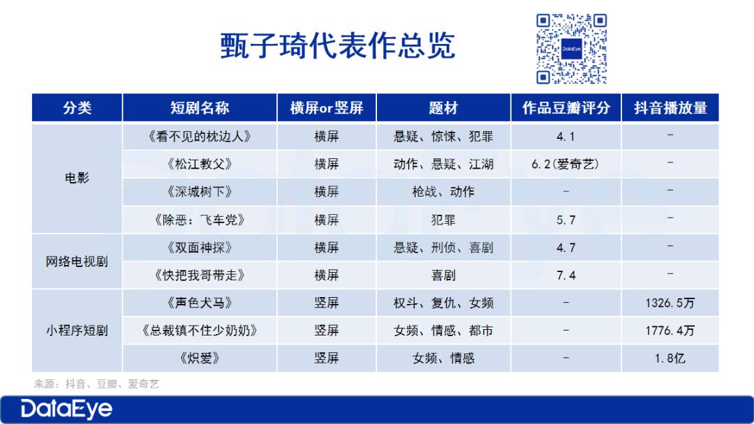 同样在影视剧中“配角多年”的还有甄子琦,他此前出演过多部网络电影和电视剧,以悬疑题材居多,可能与其较为硬朗的外貌有关,目前主演竖屏小程序短剧居多。