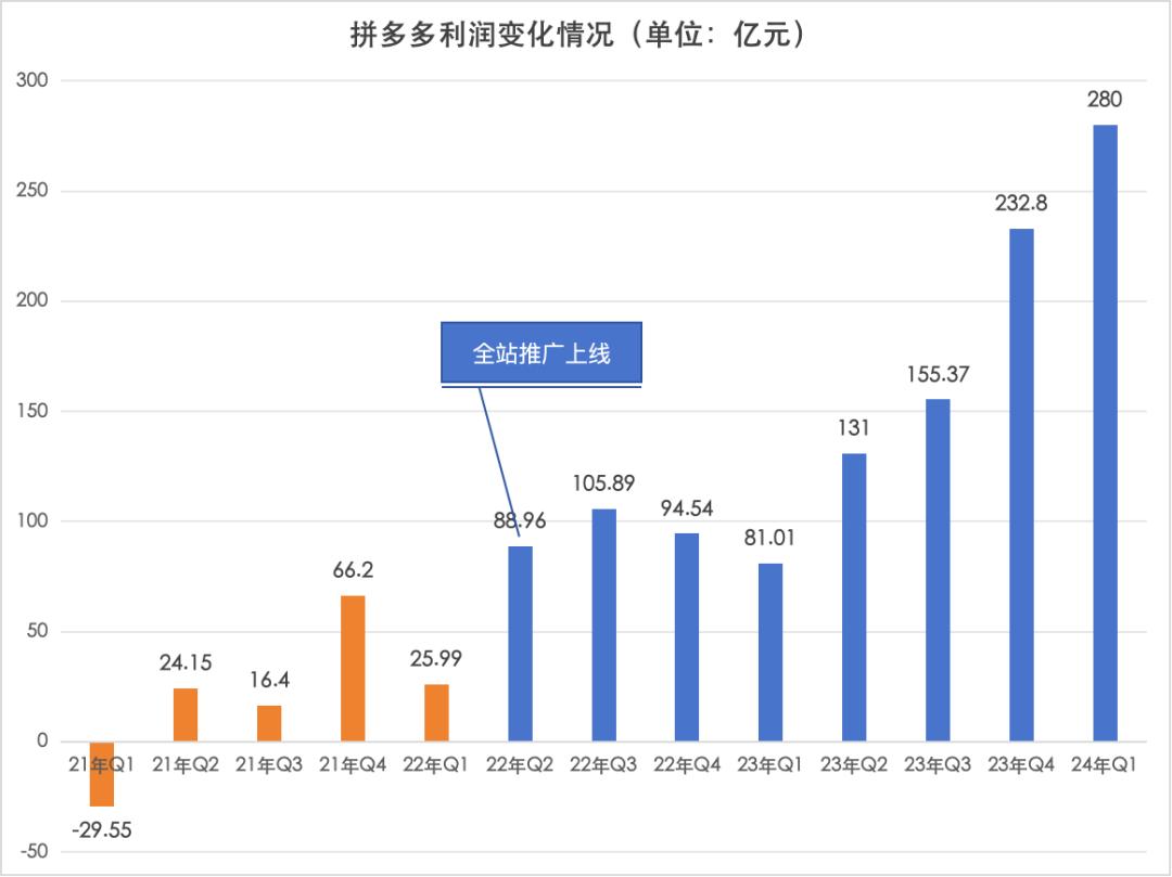 在全站推广的帮助下,拼多多不仅单季度营收增长几乎没低于50%,也很快摆脱亏损走上盈利快车道。