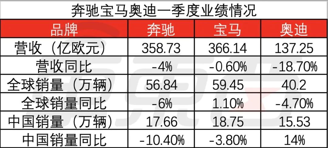 宝马和奥迪的情况也没有好多少,宝马营收366.14亿欧元(约合2849.49亿元人民币)略降0.6%,但凭借59.45万辆的全球销量和18.75万的中国销量双双拿到了BBA中的一季度中外市场的“销冠”,奥迪的营收137.25亿欧元(约合1068.30亿元人民币)则是直接跌了18.7%,跌幅明显。