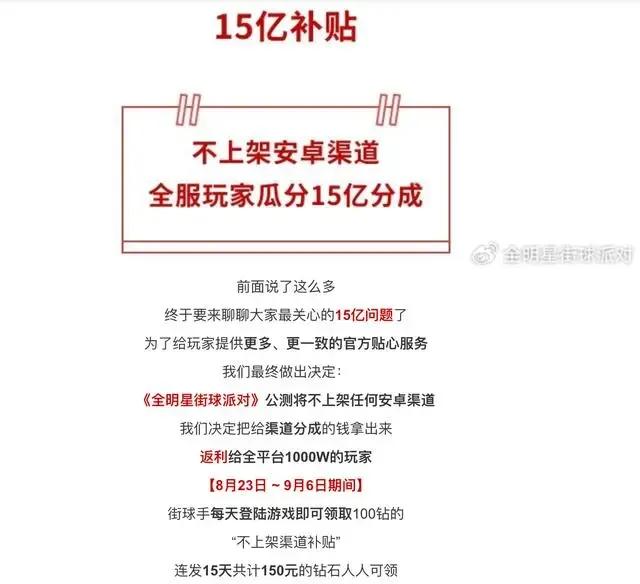 此前网易的《全明星街球派对》就是直接喊出了「不上安卓渠道,全服玩家瓜分15亿分成」的口号。