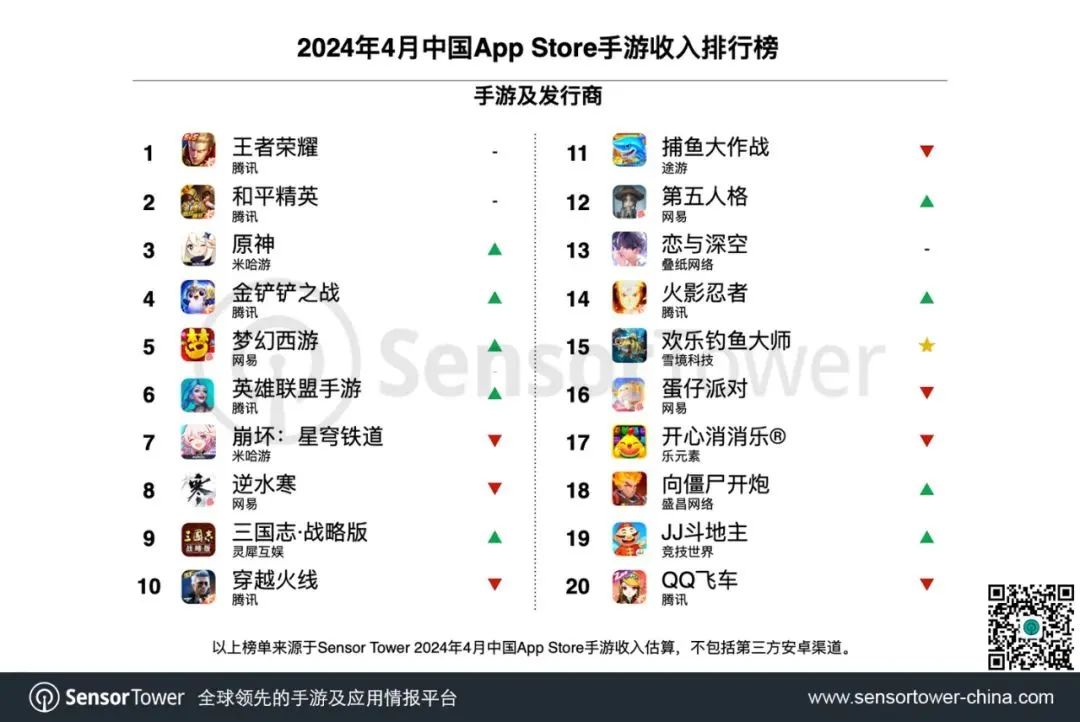 Sensor Tower发布的榜单显示,今年4月中国AppStore手游收入排行榜中,前20的产品,除了《欢乐钓鱼大师》、《向僵尸开炮》这两款显著的买量性产品外,几乎没有今年发布的新品。