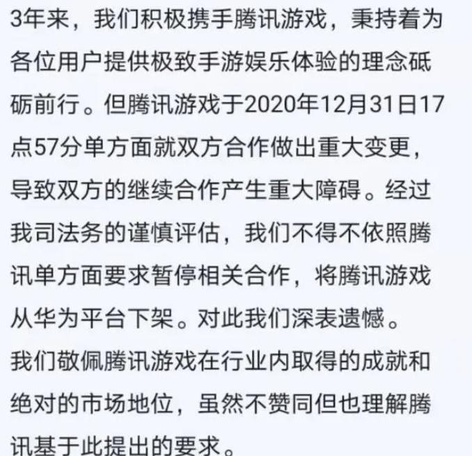 2021年1月1日,华为游戏中心发布公告,「因腾讯游戏于2020年12月31日17点57分单方面就双方合作做出重大变更,导致双方的继续合作产生重大障碍,经过我司法务谨慎评估,我们不得不依照腾讯单方面要求暂停相关合作,将腾讯游戏从华为平台下架。」
