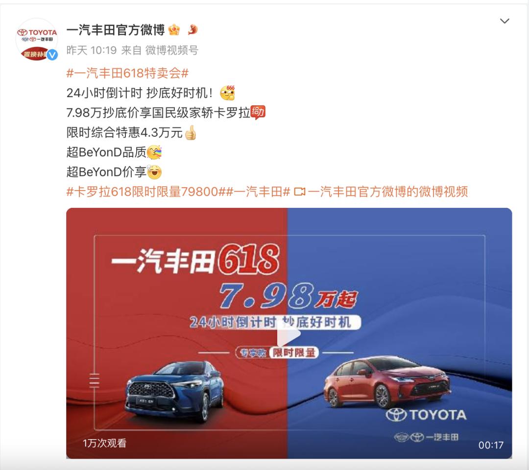 6月18日,一汽丰田官方微博宣布,即日举行24小时限时特卖会。其中,紧凑型SUV卡罗拉锐放售价9.98万元起,限时综合优惠3万元;紧凑型轿车卡罗拉售价7.98万元起,限时综合优惠4.3万元。