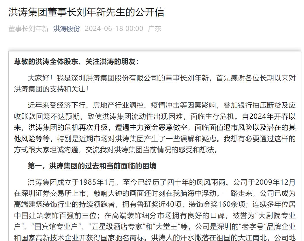 二是洪涛董事长刘年新发布了一封公开信,该篇文章收获了广泛的关注。