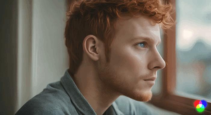 第二个视频的关键词是“脸上有雀斑的红发年轻人注视窗外”,最终呈现结果大家看看就好,能感觉Gen-2在努力营造光线在人物面部渐变的层次感,然而效果并不自然,人物脸上的雀斑没识别到,脖子被胡须侵袭成了蛇皮状,人物想眨眼又眨不了的样子一言难尽。