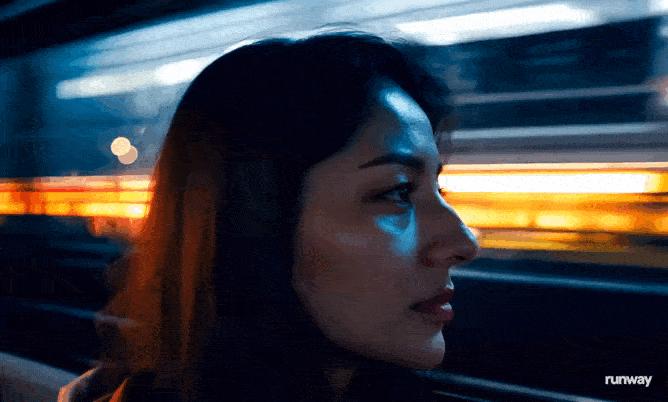 女子乘坐车辆穿过明暗交替的街道,外部光源照射在面部的变化十分自然,车外穿梭的车辆也没有出现断层等违和场景。