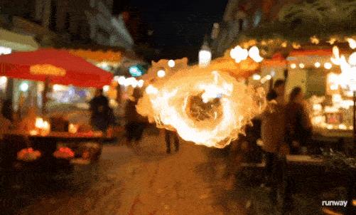 一团火焰漂浮半空,在街道游荡,火焰细节明显比其他元素要难掌握,边缘有些飘忽,加上虚化背景上的人们也有滑行的动作,这个视频算是暴露了Gen-3的缺点。