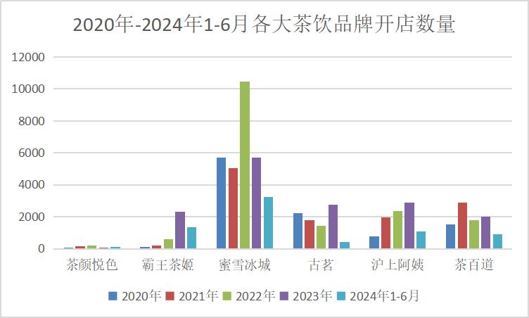 2020-2024年6月,霸王茶姬分别开了122家、215家、615家、2317家和1338家门店。2021年开始,霸王茶姬的开店速度就远超茶颜悦色,特别是2023年,霸王茶姬新开门店数比2022年几乎翻了3倍,而茶颜悦色新开门店数反而比2022年少了一半。2023年,霸王茶姬新开店数是茶颜悦色的23.88倍。