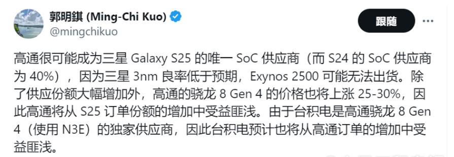 而其实这跟芯片涨价有直接关系,据天风国际证券分析师郭明錤称,由于三星3nm良率低于预期,Exynos 2500 可能无法出货,高的供应份额将大幅增加,骁龙 8 Gen 4 的价格也将上涨 25-30%。由于台积电是高通骁龙 8 Gen 4(使用 N3E)的独家供应商,因此台积电预计也将从高通订单中受益匪浅。