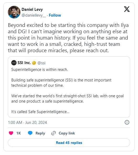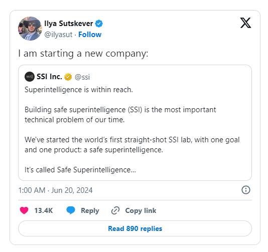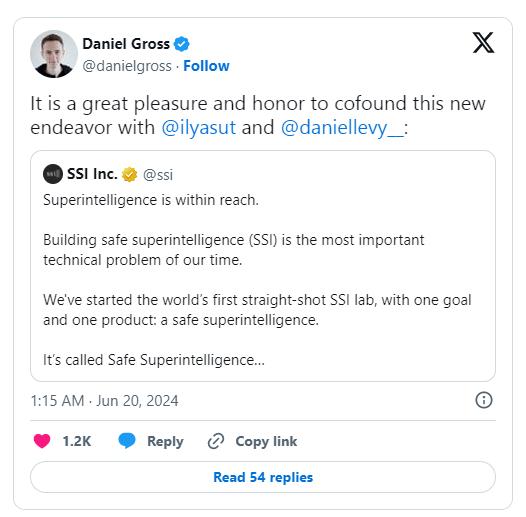 腾讯科技讯 6月20日消息,据国外媒体报道,前OpenAI首席科学官、联合创始人伊尔亚·苏茨克维(Ilya Sutskever)周三宣布,与曾在OpenAI的同事丹尼尔·列维(Daniel Levy),以及前苹果人工智能部门负责人、Cue联合创始人丹尼尔·格罗斯(Daniel Gross)携手,共同成立致力于开发安全超级智能技术的新兴企业Safe Superintelligence(简称“SSI”)。该公司的宗旨是在一个纯粹的研究机构内开发安全、强大的人工智能系统,并声明近期无意销售人工智能产品或服务。
