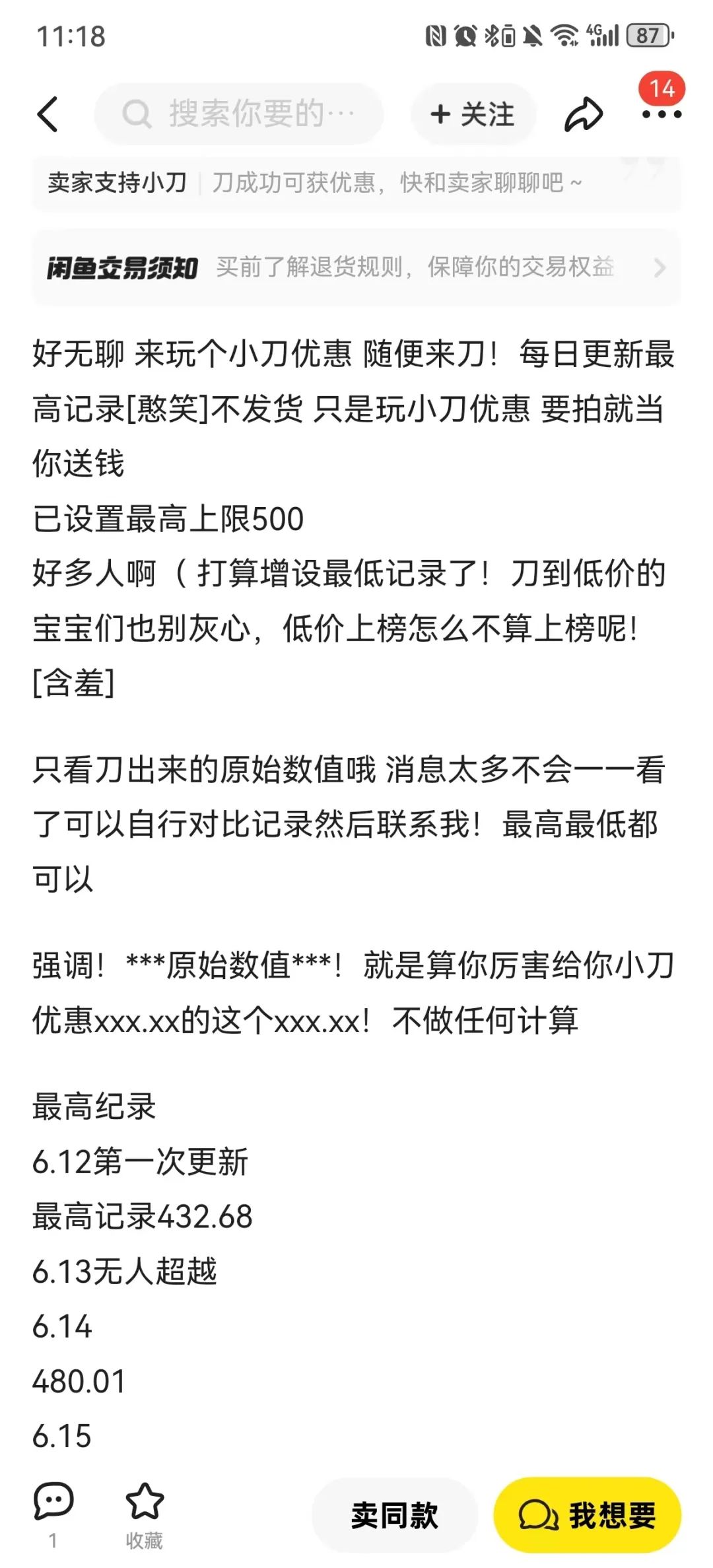 在其他平台这可能只是常规的优惠互动,但在闲鱼卖家能专开一个商品,把优惠玩成手气大比拼。在闲鱼搜索“小刀优惠”,不少卖家挂出了小刀游戏专属链接,每日更新大家刀出的最高记录,甚至部分卖家还会给刀出最高优惠的玩家发放奖金。