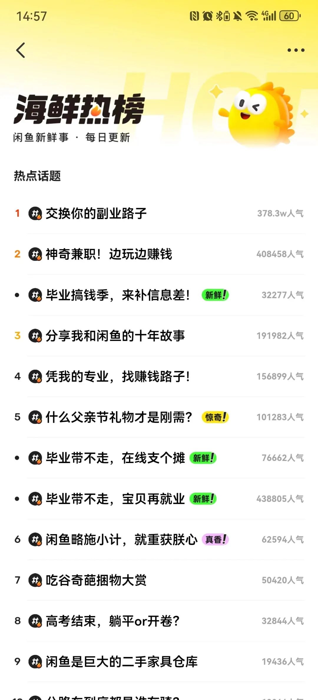 闲鱼官方也在助推用户社交行为的增长。2023年品牌升级大会后,闲鱼官方推出了“海鲜市场”,将以往电商平台以品作为区分的逻辑,转换为以话题圈子为核心的分类逻辑。
