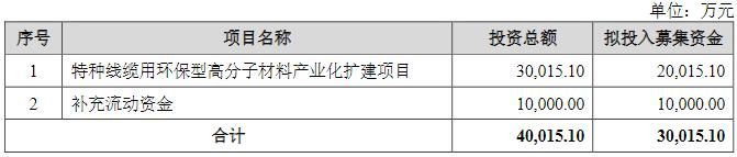 本次IPO募投拟募资3.00亿元用于特种线缆用环保型高分子材料产业化扩建项目和补充流动资金。其中,特种线缆用环保型高分子材料产业化扩建项目将新增4套生产线,其中500kV及以下过氧化物可交联电缆料生产线设备1套,35kV及以下过氧化物可交联电缆料生产线设备1套,新能源特种材料生产线设备2套。项目达成后,每年将新增500kV及以下过氧化物可交联电缆料20,000吨,35kV及以下过氧化物可交联电缆料12,000吨,新能源特种材料38,000吨的产能。