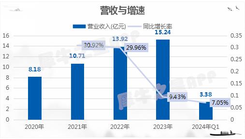 根据招股说明书,公司业绩保持较好的增速。2020-2023年,公司营收从8.18亿元增长至15.24亿元,CAGR达23.04%,其中2021年和2022年的同比增长率分别达30.92%和29.96%;2024年Q1,公司营收为3.38亿元,与上年同期相比增长7.05%。