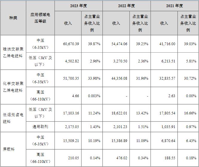 从公司的营收结构来看,公司主要产品可以分为4大类,即硅烷交联聚乙烯电缆料、化学交联聚乙烯电缆料、低烟无卤电缆料、屏蔽料,产品线覆盖面广泛。但值得注意的是,公司目前主要产品应用的电压等级主要集中于中低压(35kV及以下)领域,其中又以中压(6-35kV)为主。高压、特高压产品占营收比例较小,基本可以忽略不计,市场空间有待发掘。