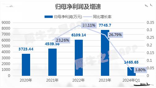 公司归母净利润从2020年的3723.44万元增长至2023年的7745.70万元,CAGR为27.66%;2024年Q1,公司归母净利润为1465.65万元,与上年同期相比增长3.80%。