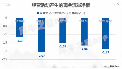 与高企的应收账款对应的是,公司经营活动现金流量净额持续告负。从数据上不难看出,公司的经营活动产生的现金流量净额与同期净利润存在较大差异。