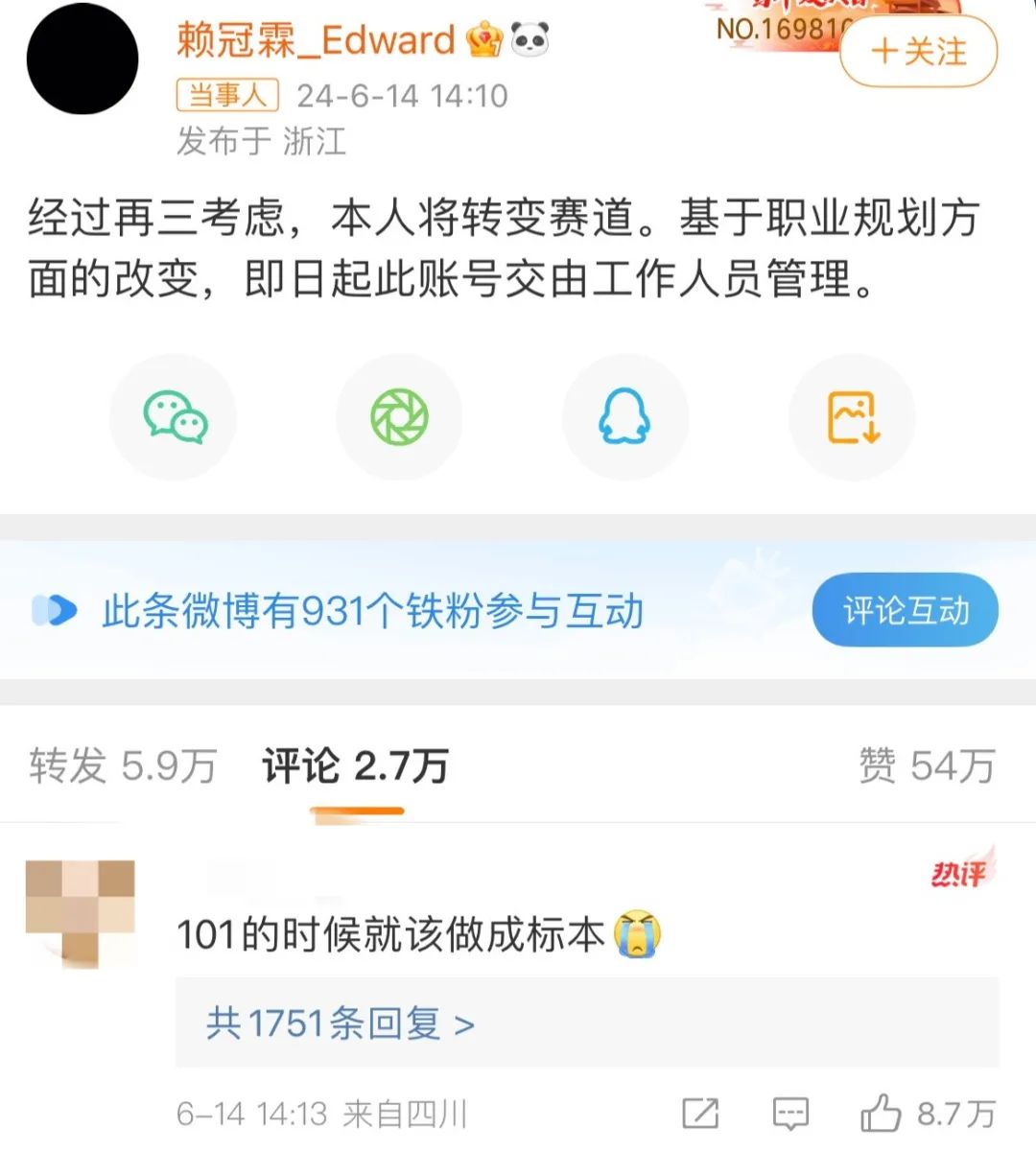 这是赖冠霖发布“将转换赛道,账号交由工作人员管理”的微博后,点赞最多的一条评论。
