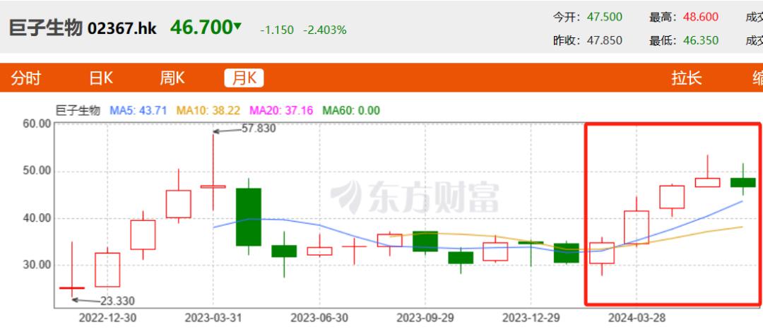 据东方财富网统计的月K线来看,2月29日-5月31日,巨子生物股价一直在上涨,最高开盘价在5月8日达52.080元/股,收盘价也曾在5月14日涨至52.180元/股,股价在5月16日涨至这一时间段为最高,达53.430元/股。