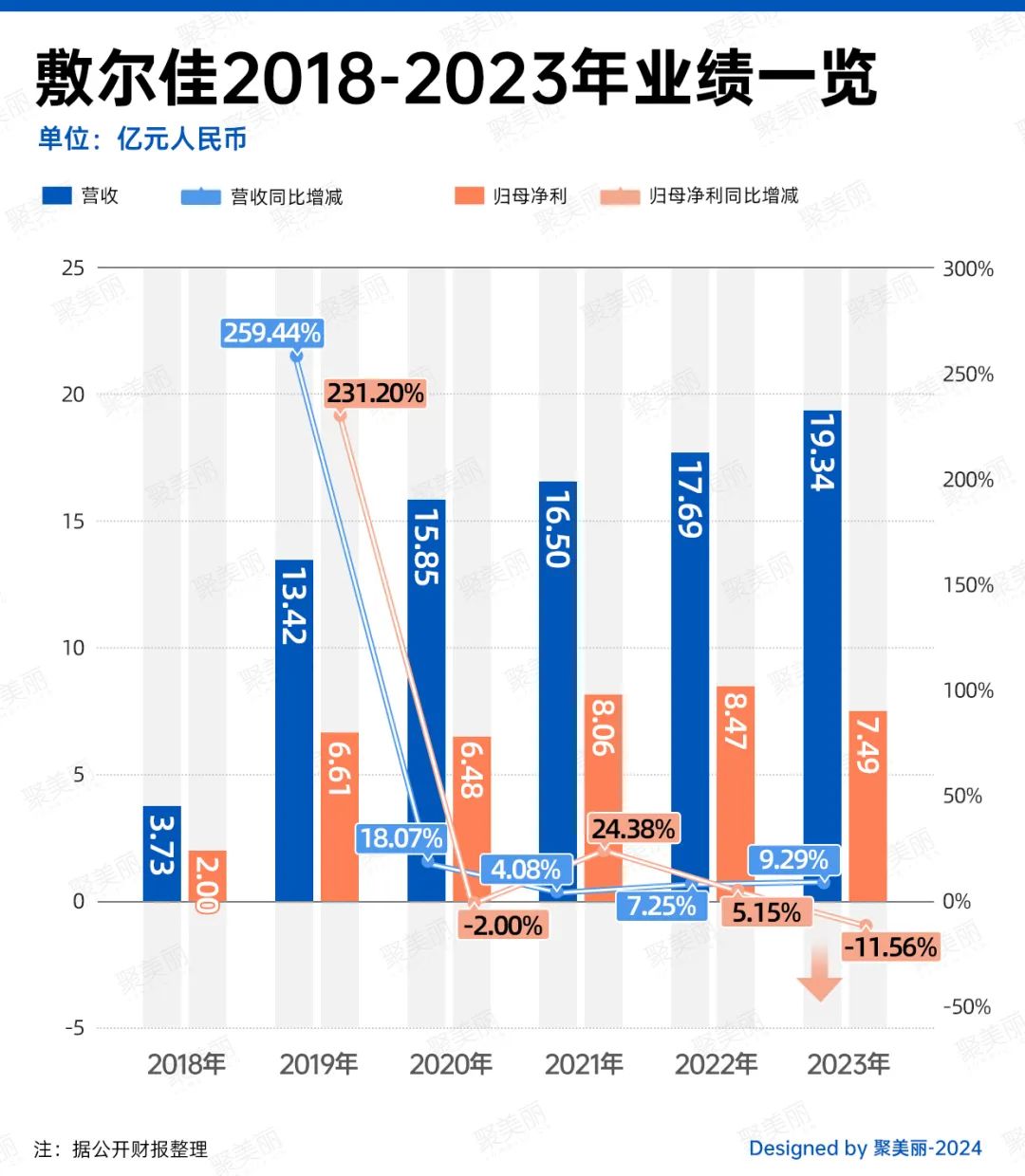 从2018年-2023年业绩来看,敷尔佳2019年营利暴涨,但之后的几年归母净利增速逐渐放缓,直至2023年出现下滑。