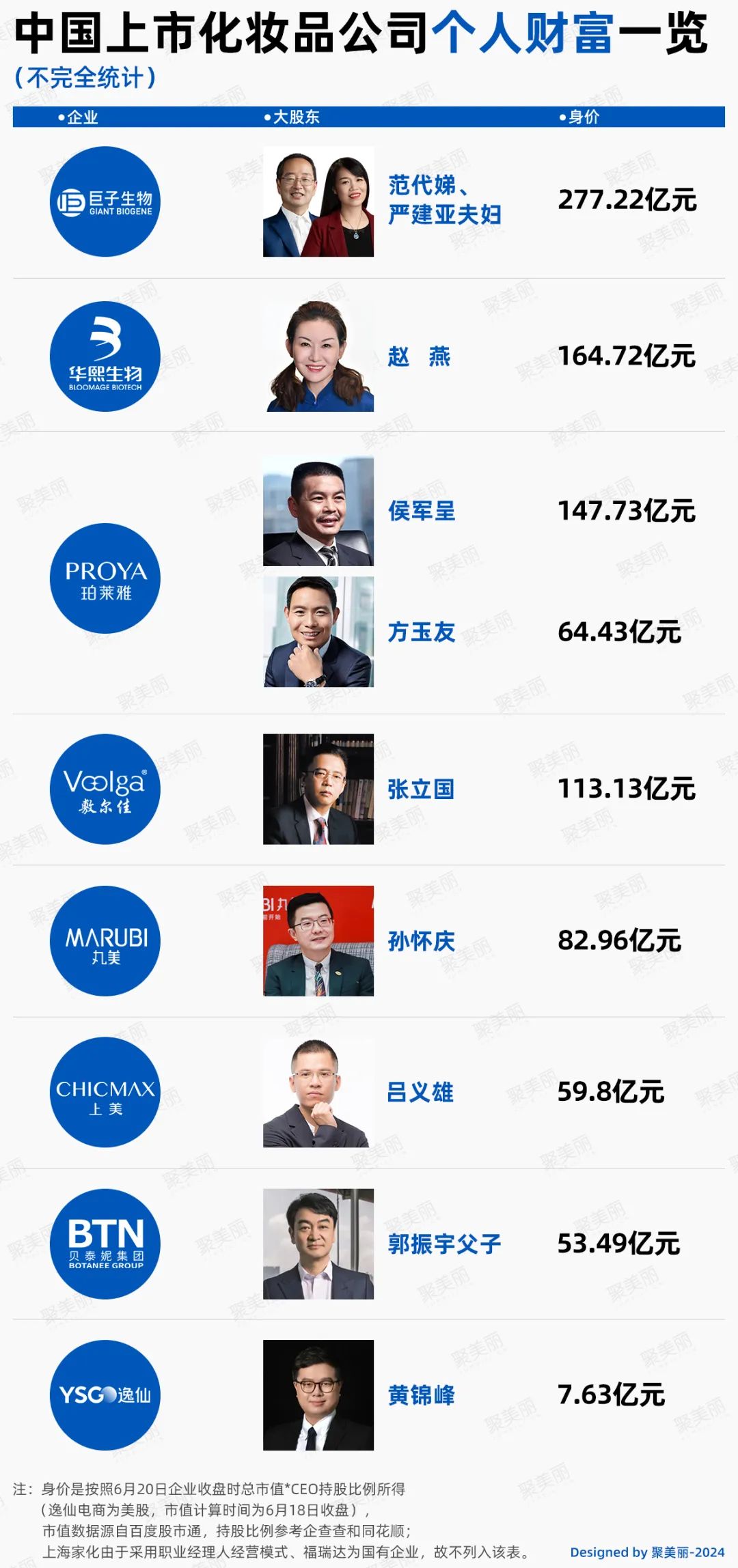 在本次榜单之中,上市仅一年多的巨子生物,创始人范代娣、严建亚夫妇合计持股超60%,身价达277.22亿元,成为行业“首富”。