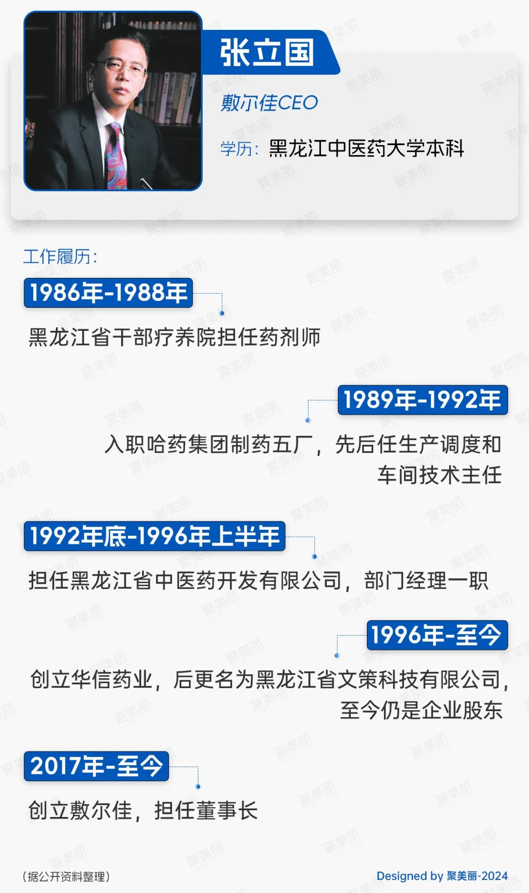 招股书显示,敷尔佳CEO张立国为中药专业、执业药师、高级工程师,拥有超30年中药、西药的研发、生产和运营经验。职业生涯初期,张立国曾担任药剂师、车间技术主任等职位,1996年成立华信药业主营药品销售。2012年,张立国进入美妆生意领域。2014年,敷尔佳前身华信药业开发了“医用透明质酸钠修复贴”,次年 (2015年) 其合作的独家代理商哈三联开始生产该系列产品,并注册“敷尔佳”品牌。