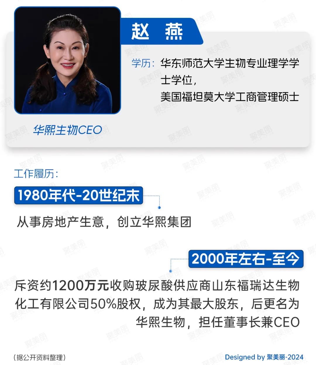 而如今,赵燕身价为164.72亿元,位列财富榜第2名,但较2021年比,缩水71%,而这背后与华熙生物发展变缓有一定的关系。不过,华熙生物作为全球第一大玻尿酸供应商,其故事始终绕不开创始人赵燕。