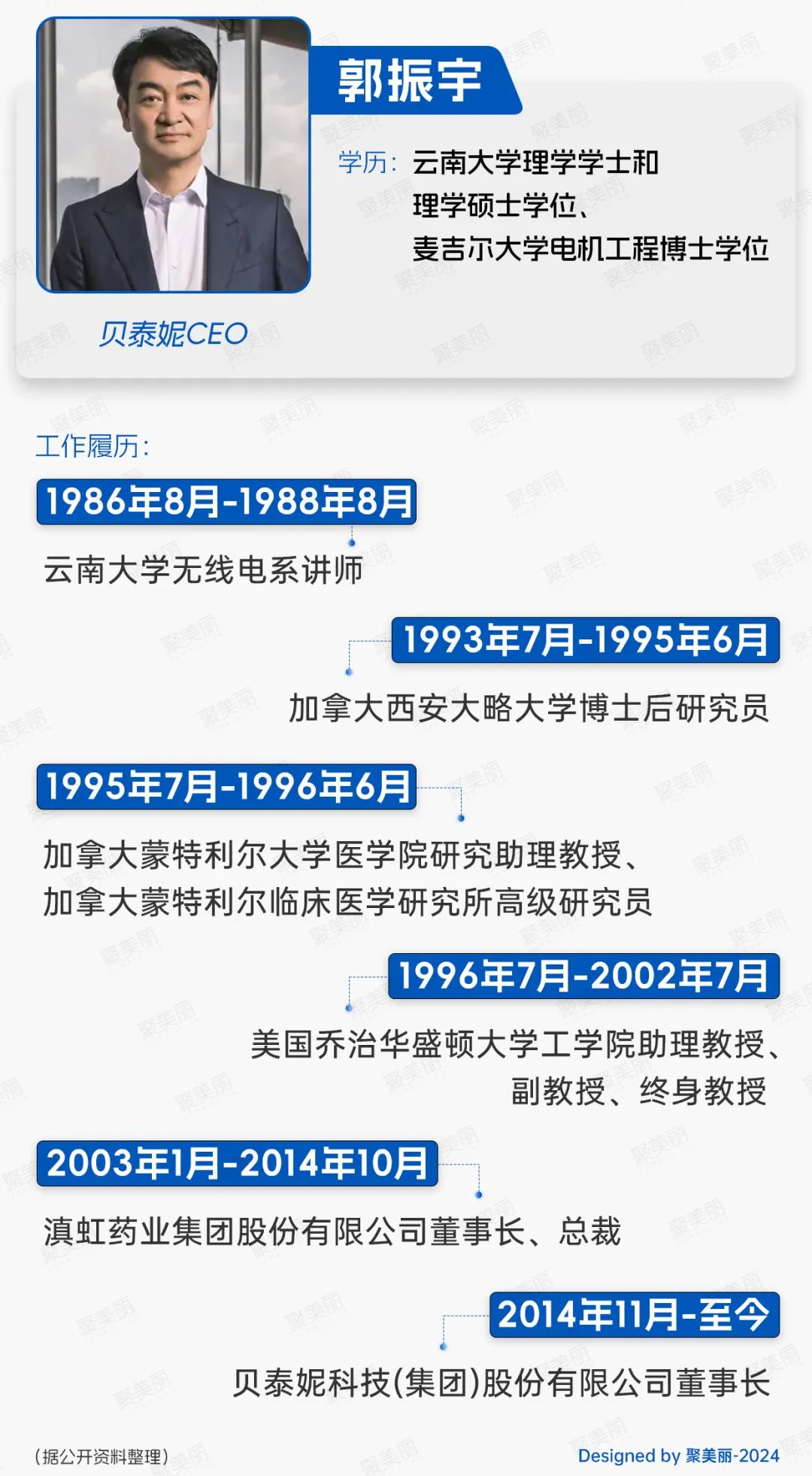 2010年,郭振宇意识到功效护肤的前景,创立贝泰妮。2012年12月,由滇虹药业孵化的薇诺娜把全部资产转让至贝泰妮。在郭振宇的带领下,薇诺娜品牌经过多年发展,在业内以聚焦敏感肌、专注研发云南植物提取物成分而出圈。