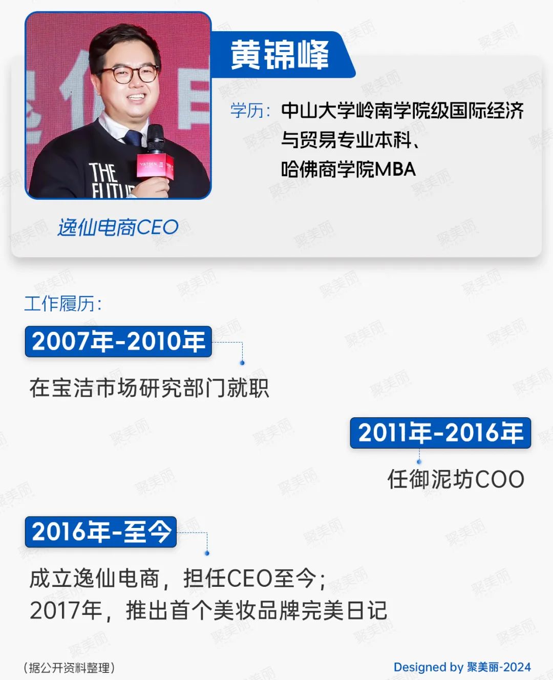 公开资料显示,黄锦峰生于1983年,2007年毕业于中山大学岭南学院级国际经济与贸易专业,并进入宝洁市场研究部门工作。工作3年后,黄锦峰进入哈佛商学院读了MBA,假期回国之际入职御泥坊 (现“水羊股份”) ,担任御泥坊 COO。