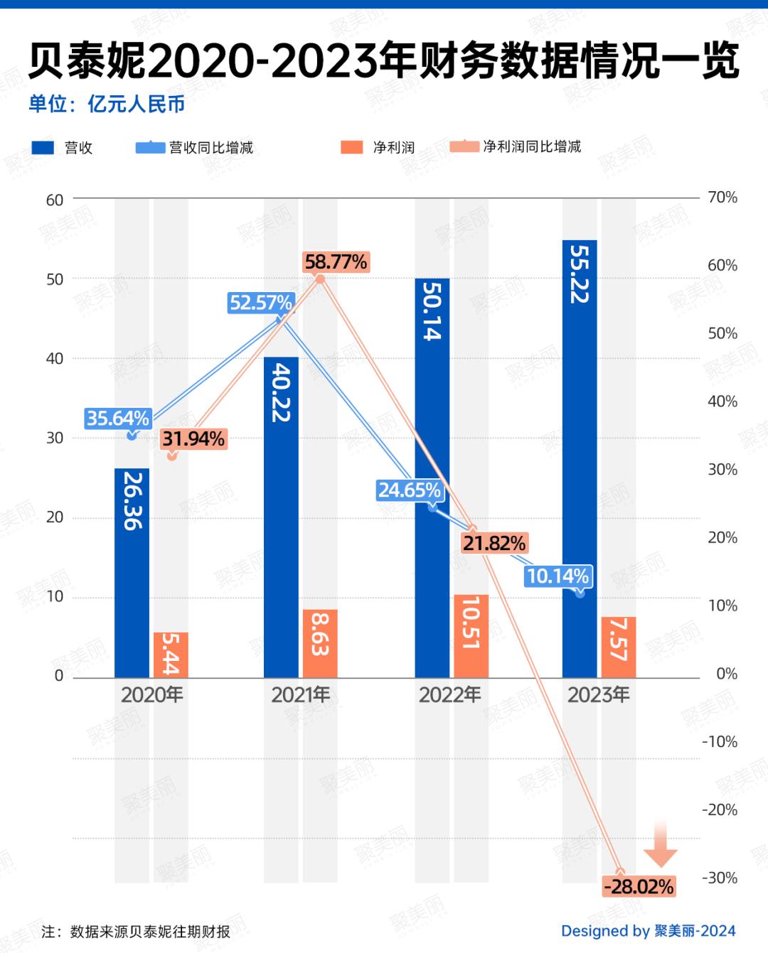 从业绩上来看,这或与贝泰妮上市后营利增速缓慢有关,尤其是2023年还出现净利润下跌近30%。