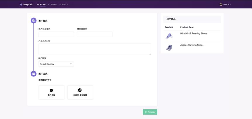 DeepLink将海外达人链接给有营销需求的B端客户群体,通过数字化平台,相比传统媒体机构能够提升5倍左右的合作效率。创始人于北川向硬氪解释,在邀约海外达人以及撮合合作的过程中,DeepLink建立了一个数字化营销平台,能够自动化去完成推⼴需求发布、达⼈匹配、达⼈合作邀约、结果交付流程。利⽤⼤数据分析、算法匹配,通过自动邀约与达人完成合作。