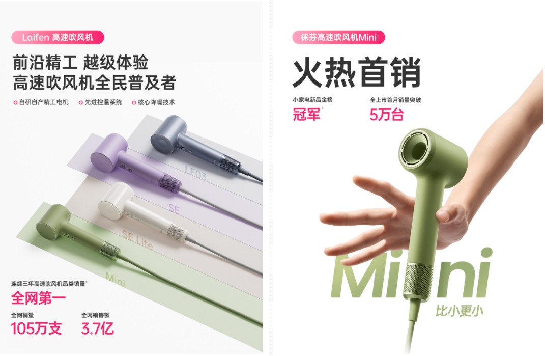 持续增长背后,是持续的创新,徕芬618期间推出了旗下新品——徕芬高速吹风机Mini,这款产品拥有轻便小巧的外观、亲肤的材质,还首次为高速吹风机加入了儿童模式,让风速和温度更好地呵护儿童细软的发质。多个创新设计的加持下,徕芬高速吹风机Mini一经上市便成为各平台新品榜单上的明星产品,截至目前销量已达5万台。