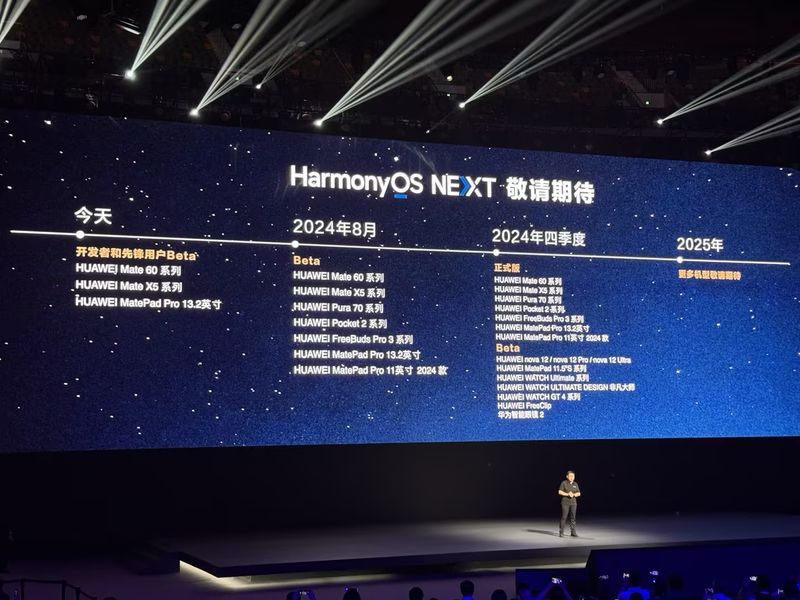 华为表示,今天发布Harmony NEXT开发者Beta版,今年第三季度发布手机/平板的Beta版,今年第四季度发布手机/平板的商用版,以及智能手表/智慧屏开发者Beta版。余承东表示,随着下半年Mate70系列的上市,鸿蒙NEXT将开启大规模商用。