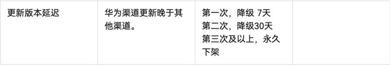 PConline发现,根据华为公布的《华为应用市场联运服务协议》,若华为渠道应用更新版本晚于其他渠道,第一次降级 7天;第二次降级30天;第三次及以上,永久下架。