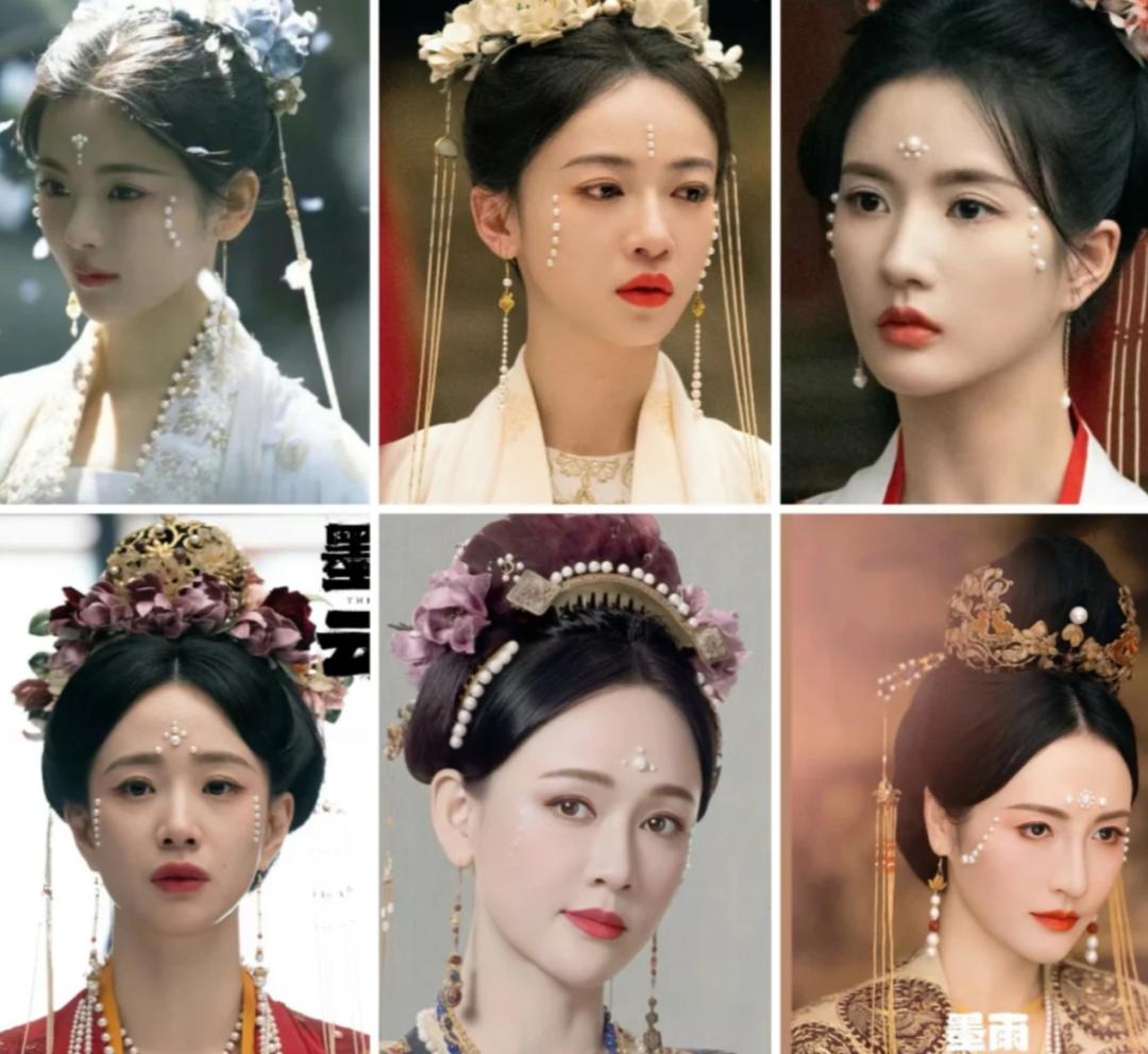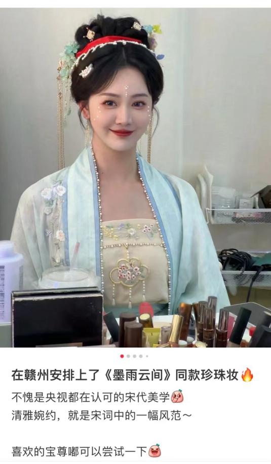 而当我们在探讨中式美学,互联网博主在这基础上进行二创,人们在研究“真正的宋制珍珠妆应该怎么化?”“古代女子脸上的珠钿有什么讲究?”的同时,早已有人发现了古装剧妆造的背后商机。