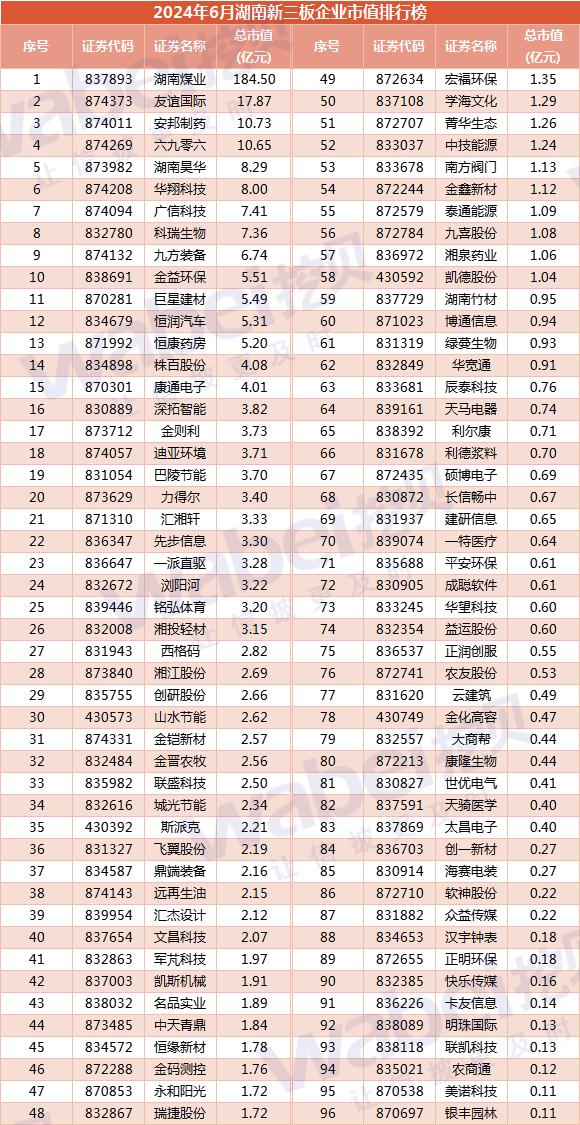 附-2024年6月湖南新三板企业市值排行榜(数据截至6月6日收盘)