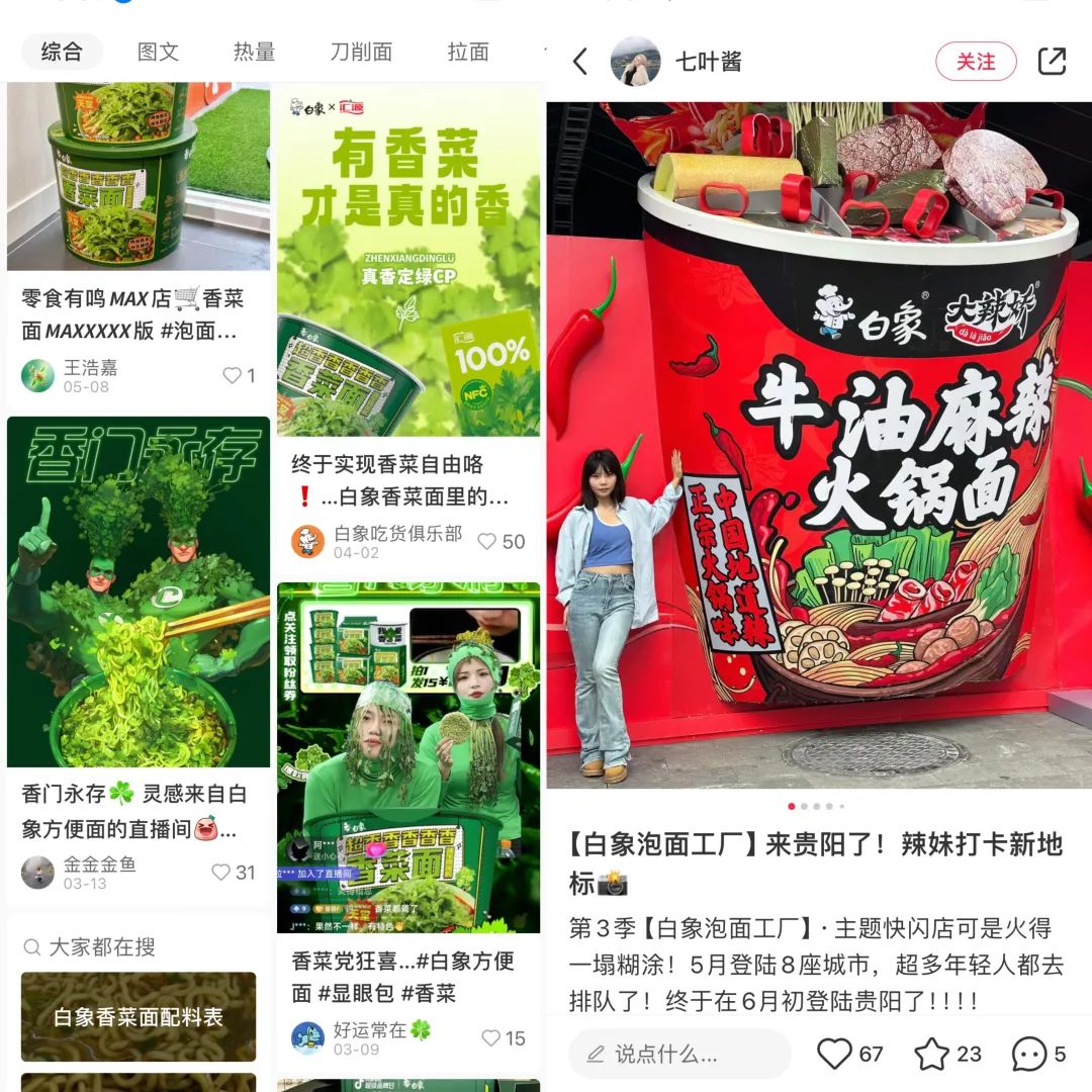 而在新品推出之前,白象还在线下落地了主题快闪店“超香香香香香菜面馆”吸引消费者打卡,同时联合达人们用创意趣味内容进一步拉高话题流量。在多重营销举措下,上市首日不到一小时就售罄。最近白象又推出牛油麻辣火锅面,并在贵阳设置主题快闪店,持续走在行业前列。