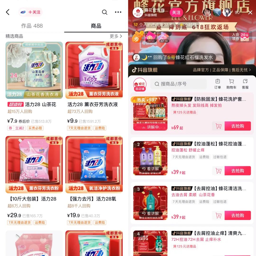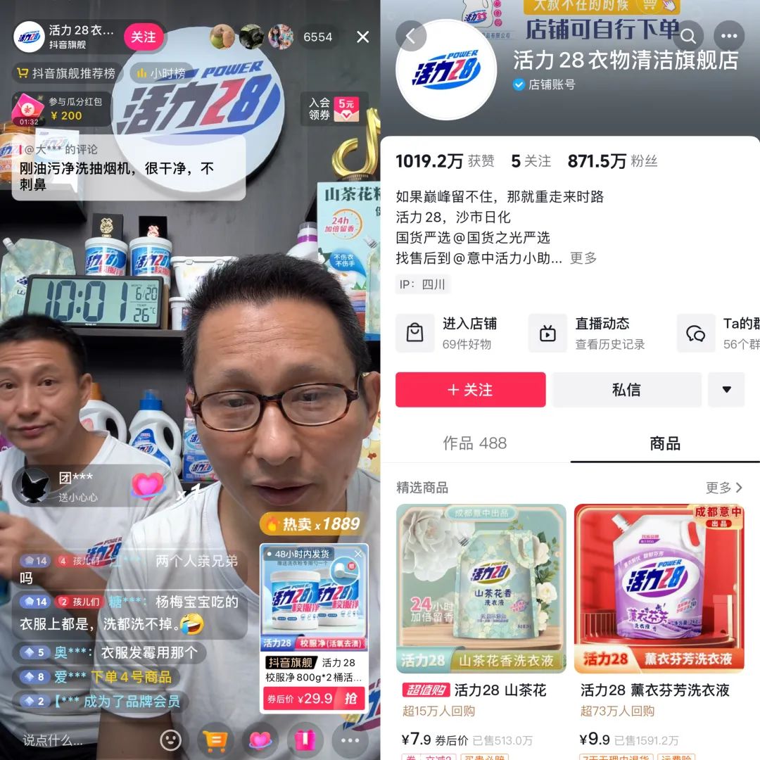 在去年7月拿到活力28的销售授权后,他们主要借助网络平台进行线上售卖,于是创建了抖音号“活力28衣物清洁旗舰店”,自主直播。当时,不管是活力集团还是成都意中,经营状况都不容乐观。