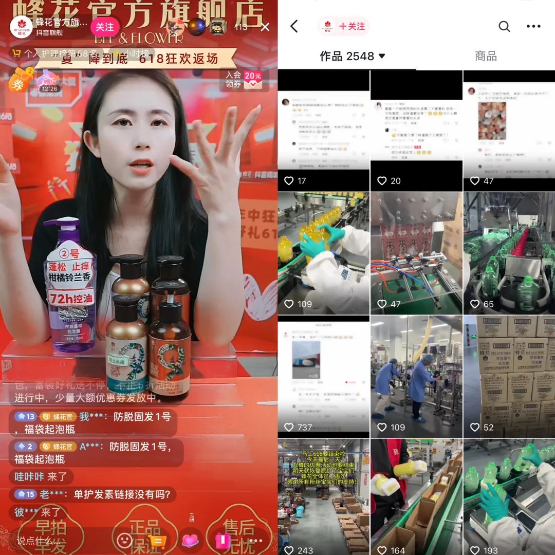 相比之下,@蜂花官方旗舰店的直播间显得有些冷清。618期间,蜂花抖音直播间的在线观看人数仅为一百余人。并且官方账号日常发布的作品数据表现平平,视频点赞量从几十到上千不等,评论区也没有了过往的热闹场面。