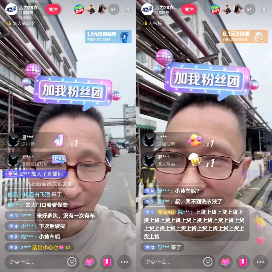 三位大叔的突然爆火给成都意中以及活力集团都来了转机。去年9月,在网友疯抢国货品牌直播间时,凭借三位主播大叔的“非专业性”,@活力28衣物清洁旗舰店 直播间跻身新星主播第一名,直播间内产品一度脱销。仅9月13日一晚,直播间里产生了超500万元的销售额。